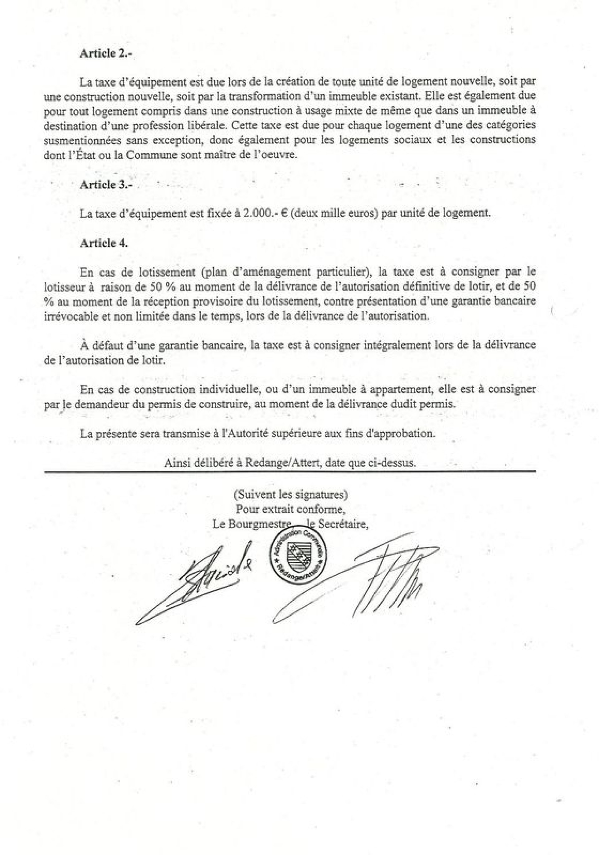 La taxe d’équipement est fixée à 2.000.- € (deux mille euros) par unité de logement.