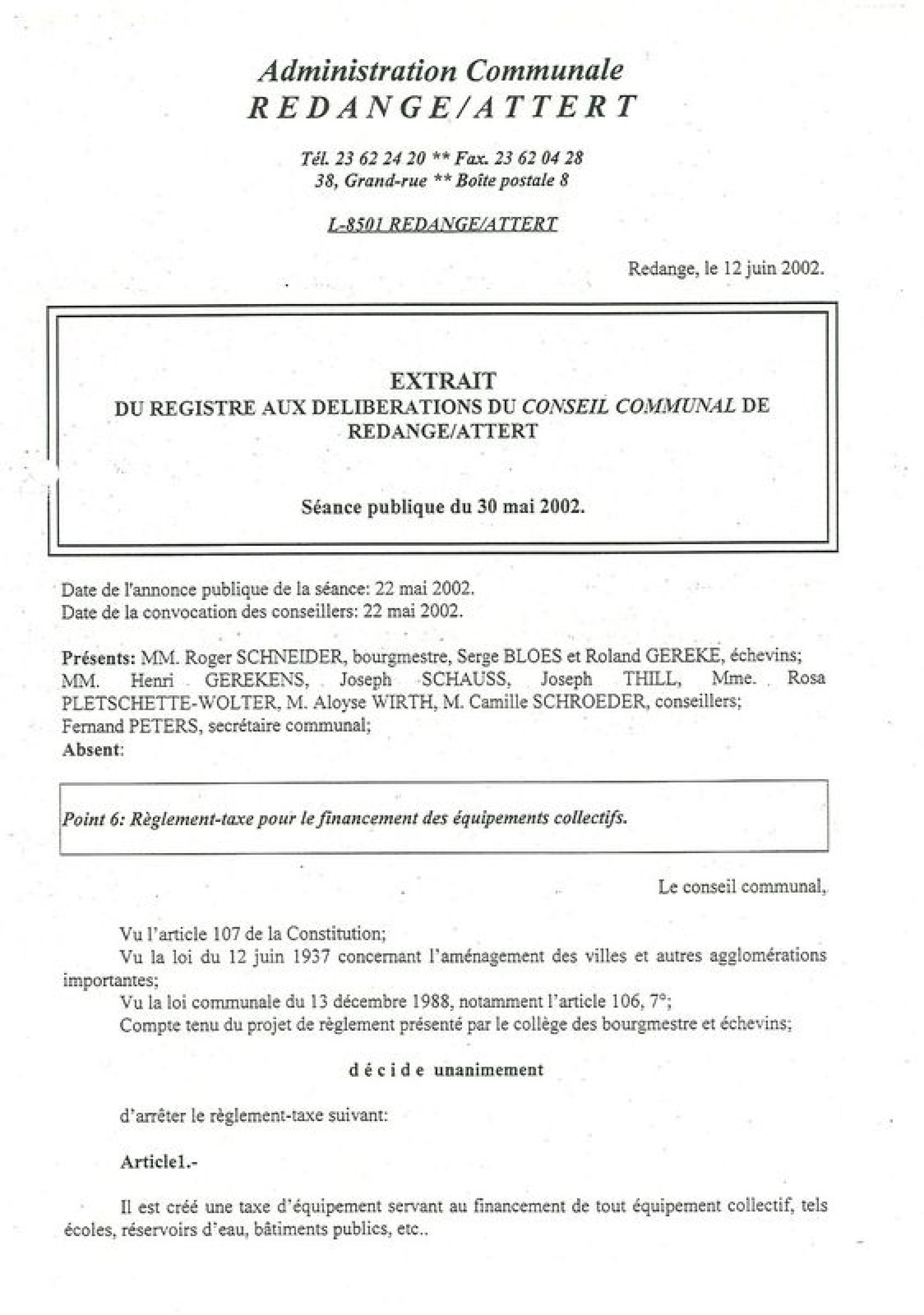 Il est créé une taxe d’équipement servant au financement de tout équipement collectif, tels écoles, réservoirs d’eau, bâtiments publics, etc.