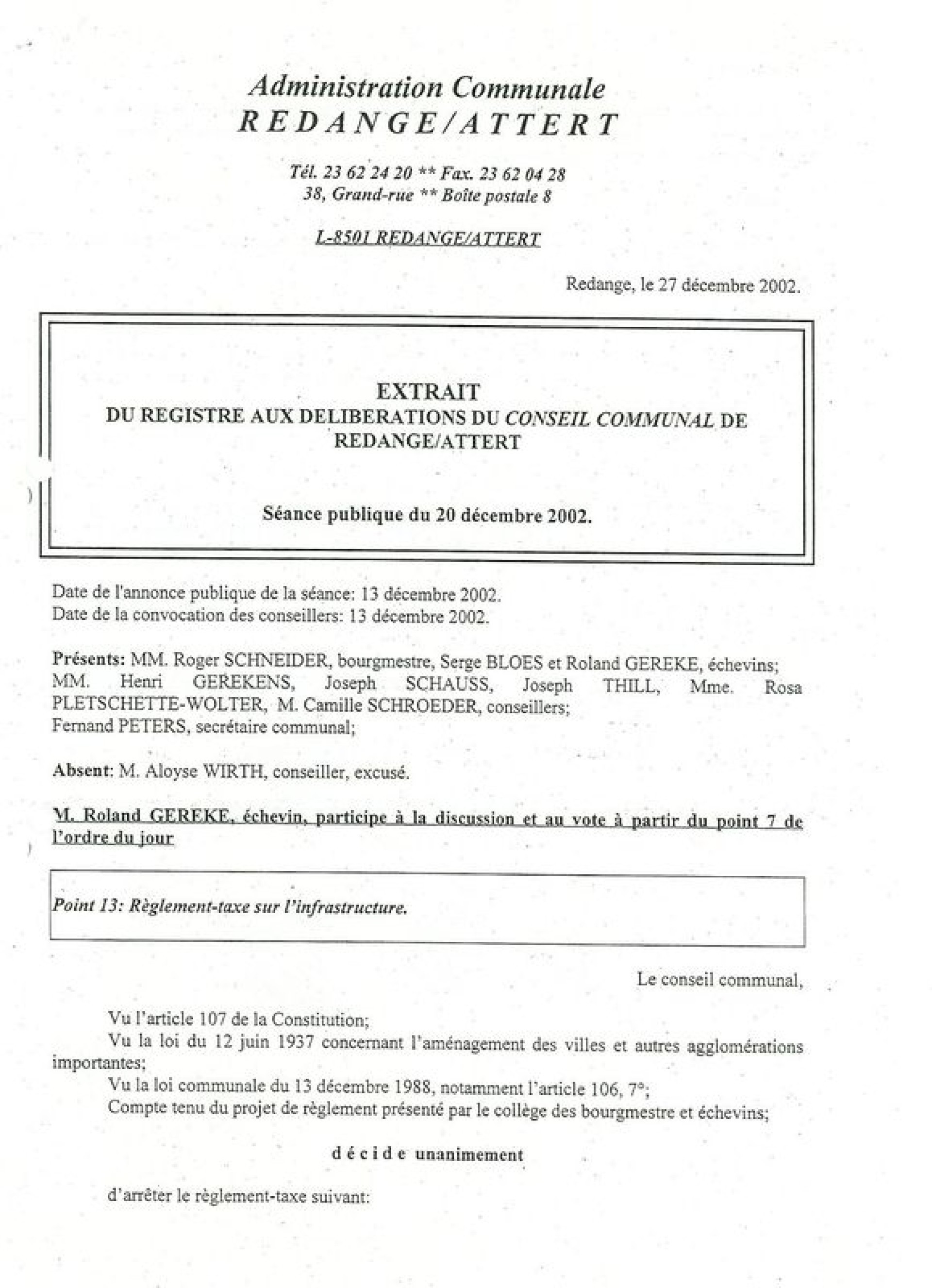 • Vu la loi communale du 13 décembre 1988, notamment l’article 106, 7° ;