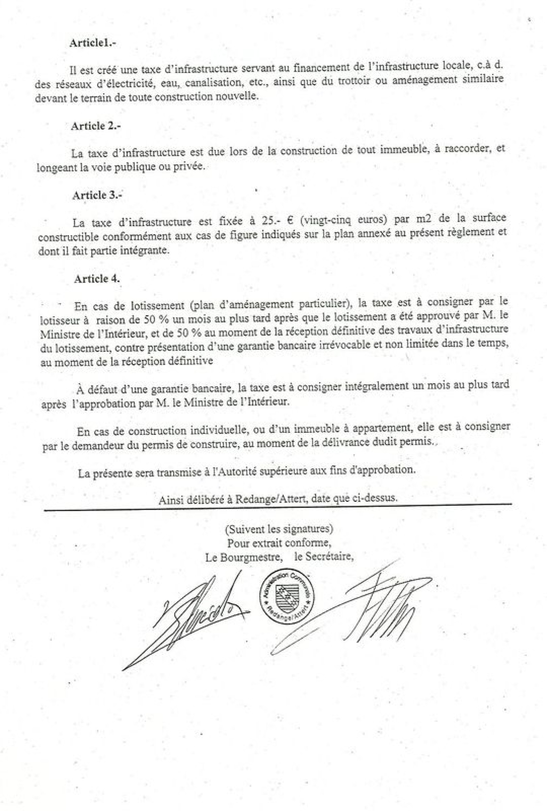 La taxe d’infrastructure est fixée à 25.- € (vingt-cinq euros) par m2 de la surface constructible conformément aux cas de figure indiqués sur le plan annexé au présent règlement et dont il fait partie intégrante.